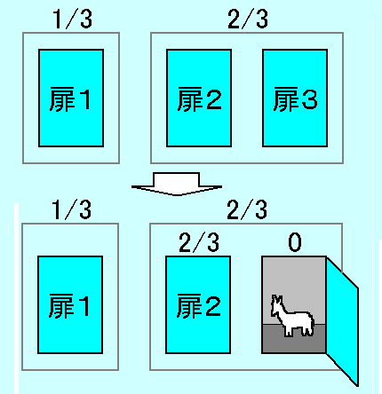 この C の扉も1/3の確率を持っていますがその確率が B の扉にたされると考えるのが正しい考え方のようです。つまり B の扉が当たる確率は2/3ということになります。A の扉は1/3の確率ですから A から B に変えることにより確率が2倍になるというわけです。