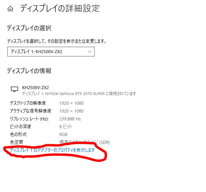 私のPCはマルチディスプレイなので「ディスプレイ1の」と表示されていますが、通常はアダプターのプロパティーを表示と出ていると思いますので選択します。