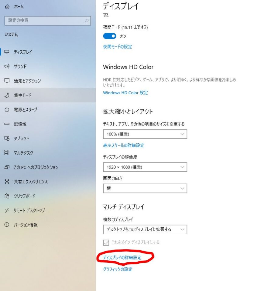 デスクトップ上で右クリックしてディスプレイ設定を選択してください。そこにディスプレイの詳細設定がありますので選択します。