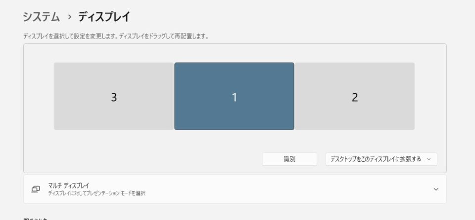 PC の設定でシステムからディスプレイの設定がありますが、そこで以下画像のように配置を設定することができるんです。これはディスプレイの物理的な配置とは別に PC 内での配置といえばいいんでしょうか?好きなように配置が可能です。また通常の横表示だけでなく縦表示もすることができゲームの種類によってはその方が良い場合もあるでしょう。以下の画像はデュアルではなくトリプルの設定になります。