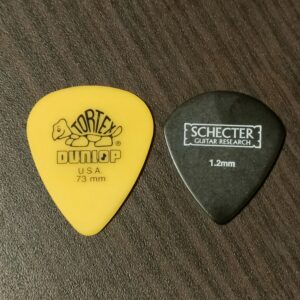 私が好んで使用しているピックは、シェクターのピックでティアドロップ型の中でも少し小さめになります。厚みは1.2ミリを使っています。同じシェクターのピックでも、1ミリと1.2ミリを比べてても明らかな違いがあります。