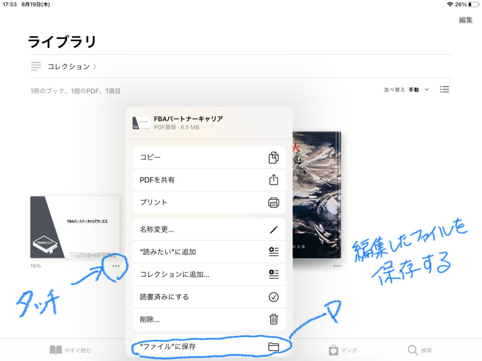 ライブラリにもどりPDFの右下をタッチペンでタッチします。それからファイルを保存するなりすればOKです。
