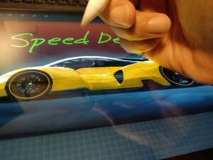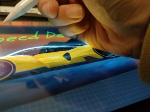 使用したアプリは procreate です。 車の画像にSpeed Demonと書きました。ペン先より先に手のひらが触れてしうと画像の赤丸印のように意図してないところに描画されてしまいます。
